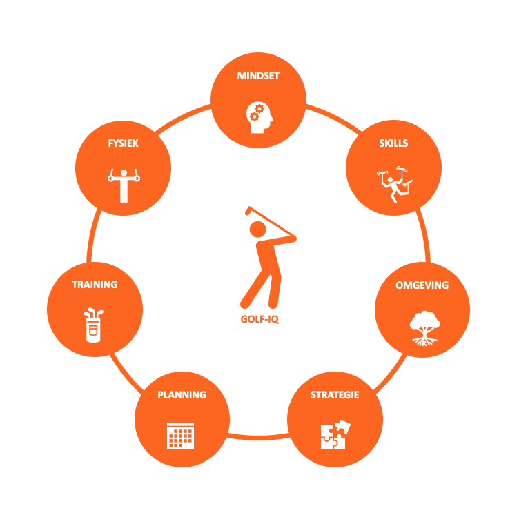 Voor wat betreft mijn gehele lesprogramma ga ik in de basis uit van het model, waarbij een golfspeler te maken krijgt met een aantal factoren: de Circle of golf. Om optimaal te kunnen scoren, zal elke golfspeler deze factoren zoveel mogelijk naar zijn/haar hand willen zetten. Het gaat in willekeurige volgorde om: Mindset, Skills, Omgeving, Strategie, Planning, Training en Fysiek.